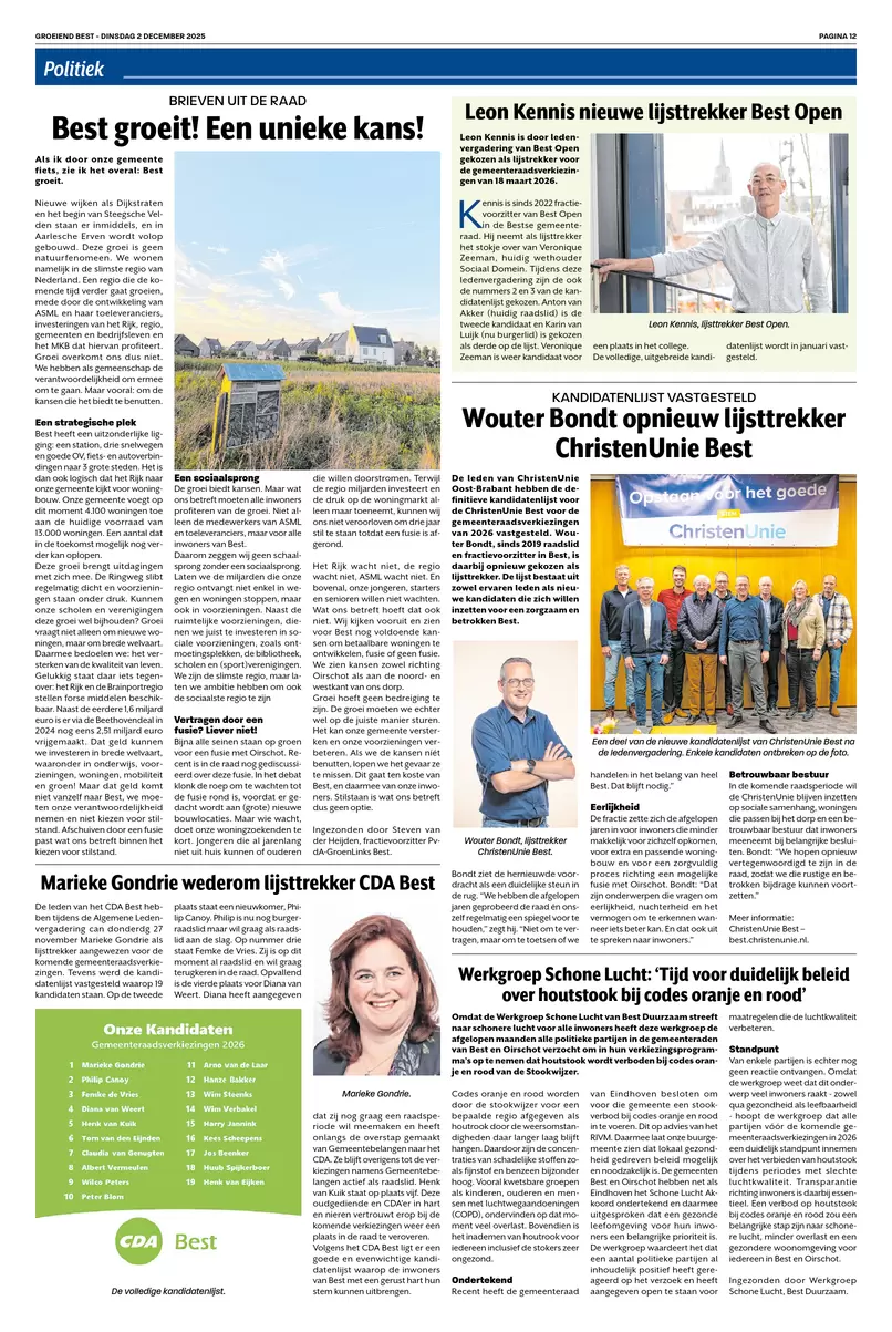 Leon Kennis is door ledenvergadering van Best Open gekozen als lijstrekker voor de gemeenteraadsverkiezingen van 18 maart 2026.